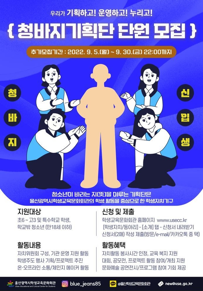 울산학생교육문화회관(관장 장삼수)은 9월 5일부터 9월 30일까지 4주간 학생자치단 활동 단원 추가 모집을 실시한다.