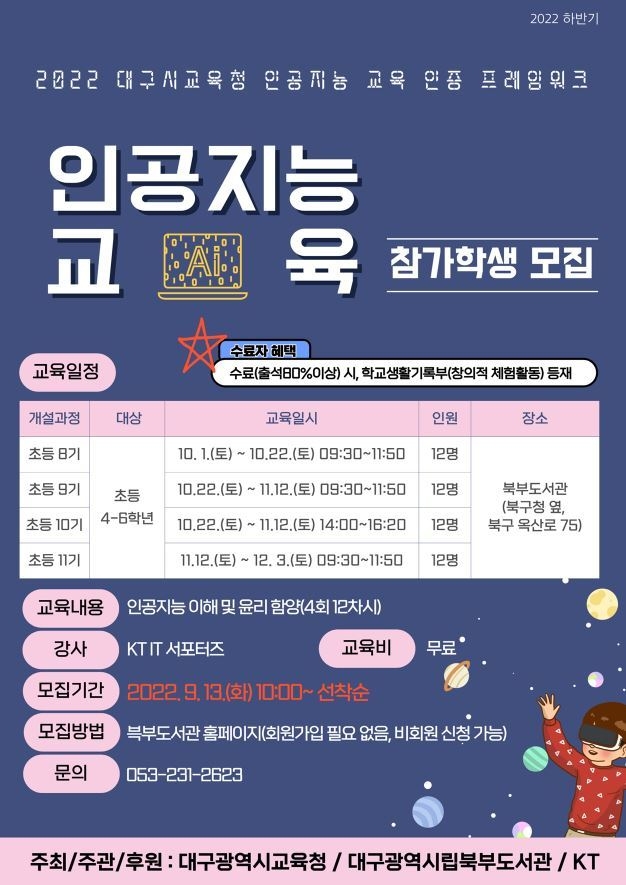 대구북부도서관(관장 이인희)은 오는 9월 13일(화)부터 학교 소프트웨어 교육과정을 지원하고 인공지능시대 미래 역량 개발을 위해 초등 고학년과 중학생을 대상으로 2022년 하반기 인공지능 교육 참가학생을 모집한다.