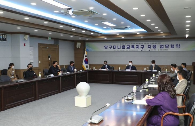양구교육지원청(교육장 이재학)은 13일(화) 11시 양구군청 중회의실에서 강원도교육감, 양구군수, 양구학교운영위원회위원장, 양구학부모연합회회장, 관내 학교장 등이 참석한 가운데 ‘2022 더나은교육지구 지정 업무협약’을 체결한다.