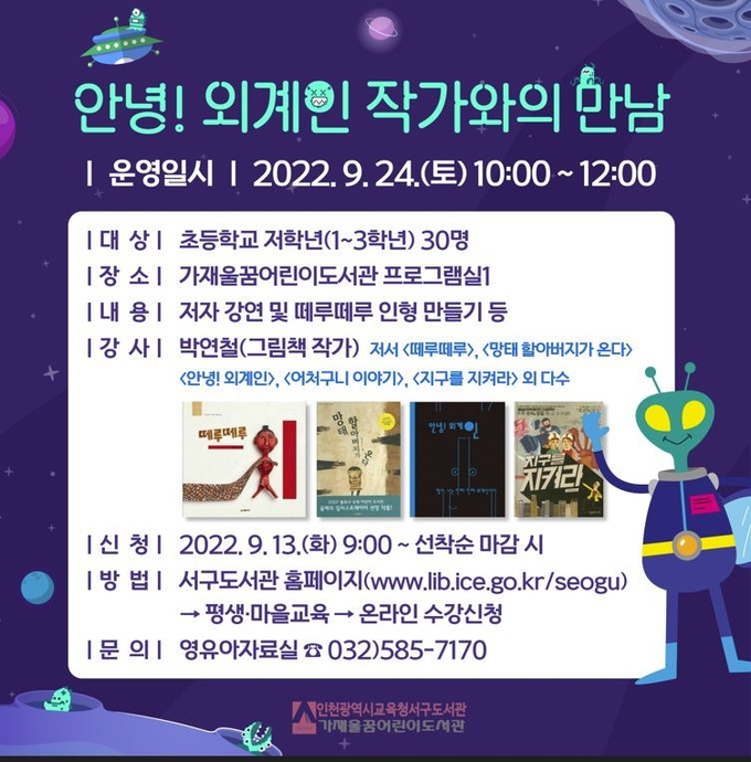 인천광역시교육청서구도서관(관장 최현옥)은 「북스타트 부모교육 지원사업」으로 24일 「안녕! 외계인 작가와의 만남」을 운영한다.