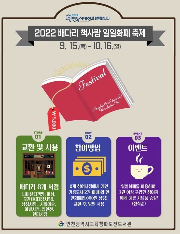 인천광역시교육청화도진도서관(관장 강신호)은 「2022년 배다리 책사랑 일일화폐 축제」를 인천 시민 대상으로 15일부터 10월 16일까지 개최한다.