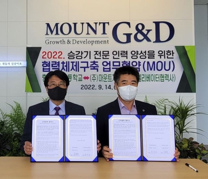 충주공업고등학교(교장 최진근)는 14일(수) 오후 2시 (주)마운트G&D와 승강기 전문 인력양성과 맞춤형 취업을 위한 업무협약을 체결했다.