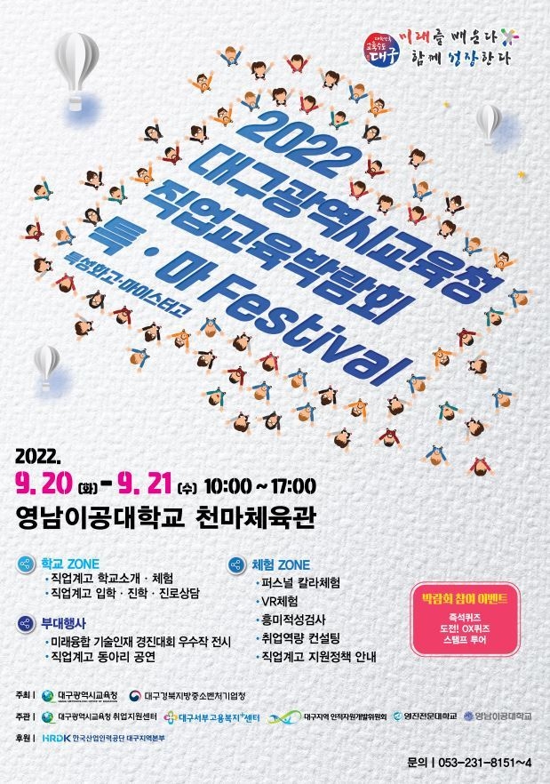 대구시교육청(교육감 강은희)은 오는 9월 20일(화), 21일(수), 양일간 영남이공대 천마체육관에서 2022 대구광역시교육청 직업교육 박람회 ‘특ㆍ마(특성화고 마이스터고의 줄임말) Festival’을 개최한다.
