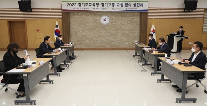 경기도교육청(교육감 임태희)은 남부청사에서 경기도교원단체총연합회(회장 주훈지, 이하 경기교총)와 2022 교섭ㆍ협의를 위한 상견례 자리를 마련했다.