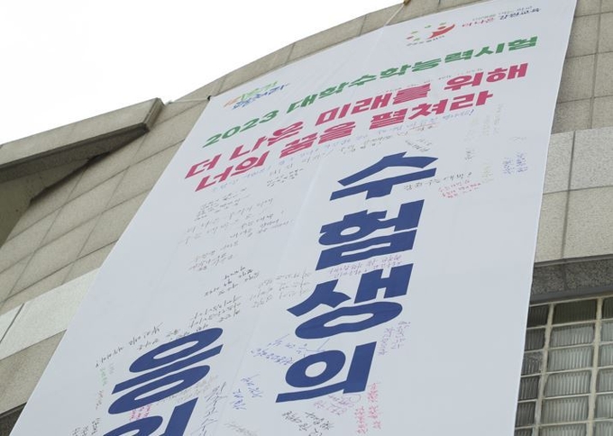 강원도교육청(교육감 신경호)은 3일(목) 오후 3시, 도교육청 야외주차장에서 2023 수능 수험생들을 응원하기 위한 대형 현수막을 게시했다.