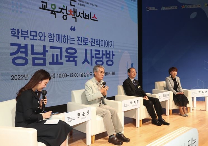 경상남도교육청(교육감 박종훈)은 11월 4일 김해 남명아트홀에서 학부모 150여 명을 대상으로 진로와 진학을 주제로 학부모와 소통하는 ‘경남교육 사랑방’을 열었다. 현장 참여가 어려운 학부모를 위해 온라인 생중계도 진행했다.