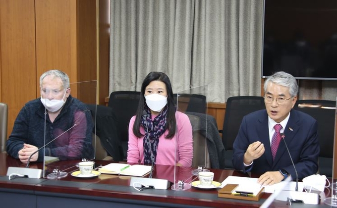 8일 오전 경남교육청 본청 중회의실에서 ‘빅데이터와 인공지능을 기반으로 한 미래교육’을 주제로 기자 다모임(간담회)가 열렸다. 이날 두 교수는 아이톡톡의 가능성을 높이 평가하고 전 세계의 교육환경을 바꾸는 큰 힘이 될 것이라고 내다봤다.
