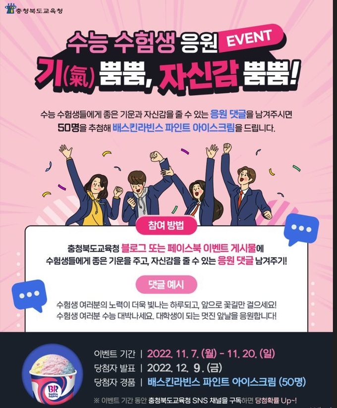 한편, 충북교육청은 수험생 응원 이벤트 “기(氣) 뿜뿜, 자신감 뿜뿜!” 도 함께 진행한다.