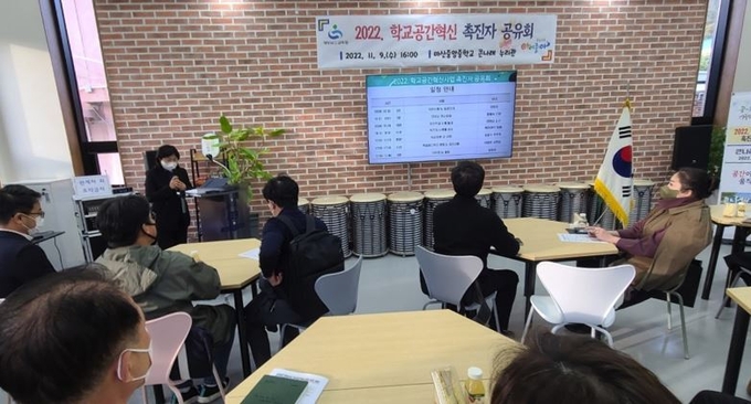 공유회에서는 창원 안청초와 양산 신주중의 자율형 학교공간혁신, 창원토월고와 마산제일여고의 고교학점제를 대비한 학년별 생활거점 공간(홈베이스)과 학습카페, 김해봉황초의 1학년 교실 공간혁신 사례를 발표했다.
