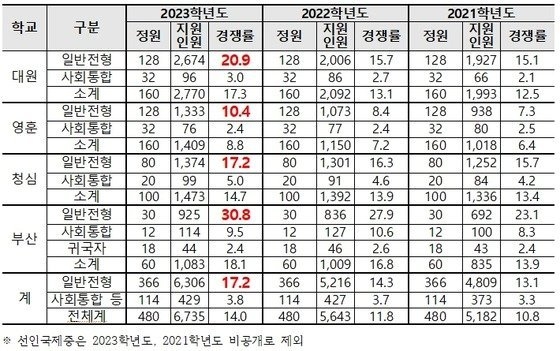 이에 따라 전국 4개 국제중 일반전형 평균 경쟁률은 지난해 14.3대 1에서 17.2대 1로 높아졌다. 사회통합 등 전형도 3.7대 1 에서 3.8대 1로 상승했다.