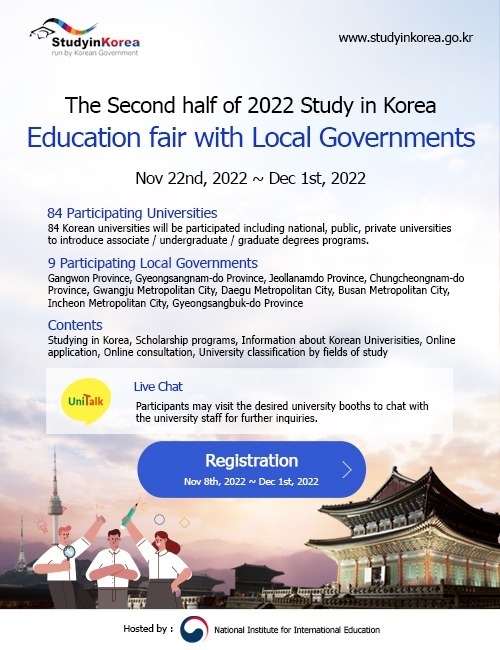 교육부와 국립국제교육원은 22일부터 12월1일까지 '2022 지자체와 함께하는 한국유학박람회'를 온라인으로 연다고 20일 밝혔다.