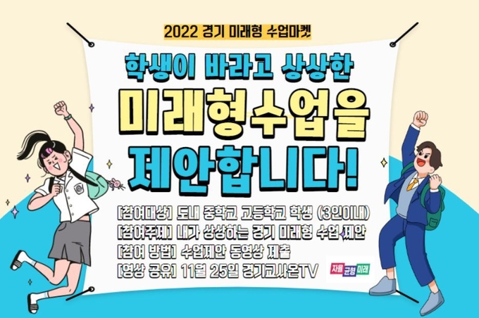 경기도교육청(교육감 임태희)은 학생이 미래형 수업에 대한 바람과 의견을 직접 제안하는 ‘2022 경기 미래형 수업 마켓’을 연다.