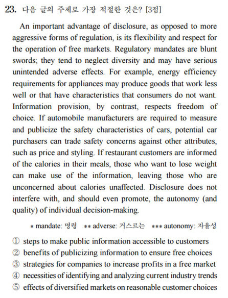 23번 문항은 지문을 읽고 주제로 가장 적절한 것을 고르는 3점짜리 문항으로, 해당 지문은 캐스 선스타인 미국 하버드대 교수가 2020년 9월 출간한 저서인 ‘Too Much Information’에서 발췌됐다.