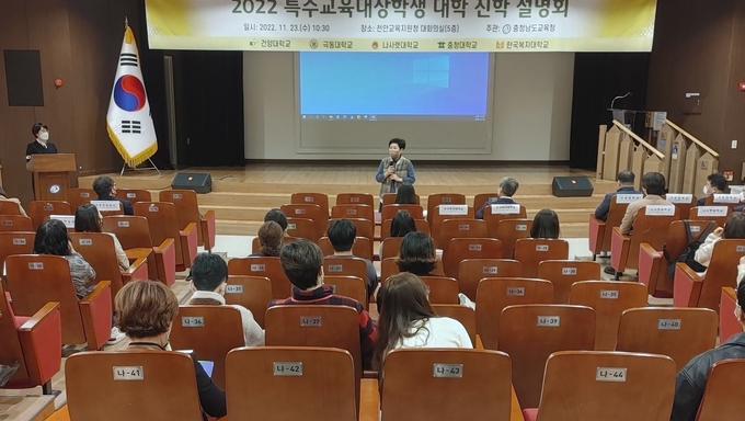 충남교육청(교육감 김지철)은 23일(수) 천안교육지원청 대회의실에서 특수교육대상학생 및 보호자, 특수교사, 진로전담교사(특수)를 대상으로 「2022 특수교육대상학생 대학 입학 설명회」를 개최했다고 밝혔다.