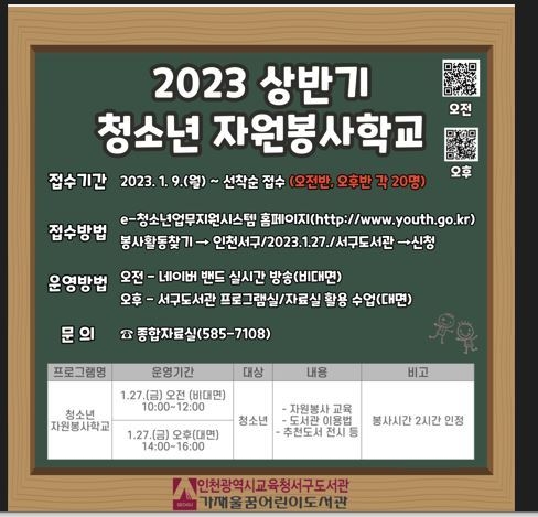 인천광역시교육청서구도서관(관장 박정희)은 관내 청소년들의 자원봉사 활동 활성화와 교육을 위한 「2023 상반기 청소년 자원봉사학교」를 27일 운영한다.