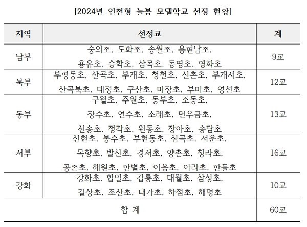 인천시교육청(교육감 도성훈)은 올해 2024년 인천형 늘봄 모델학교 공모 결과 초등학교 60곳을 선정했다고 24일 밝혔다.
