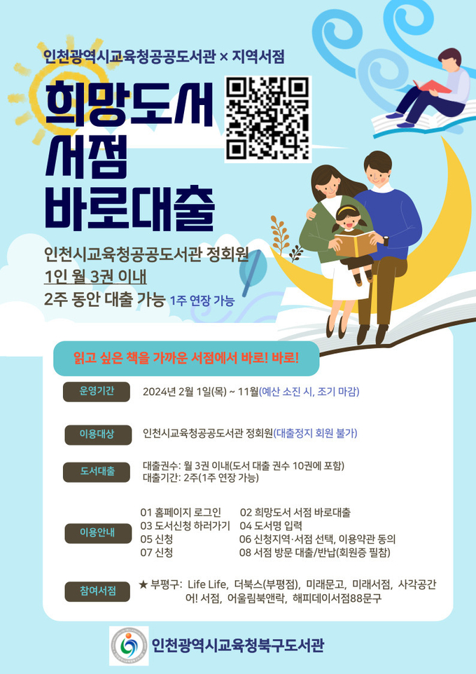 북구도서관은 인천 시민에게 다양한 독서생활 편의를 제공하기 위해 희망도서 신청에서 대출까지의 대기 시간을 줄이고 도서관을 방문하기 어려운 직장인도 도서관이 아닌 서점에서 원하는 책을 바로 대출할 수 있도록 서비스를 재개한다.