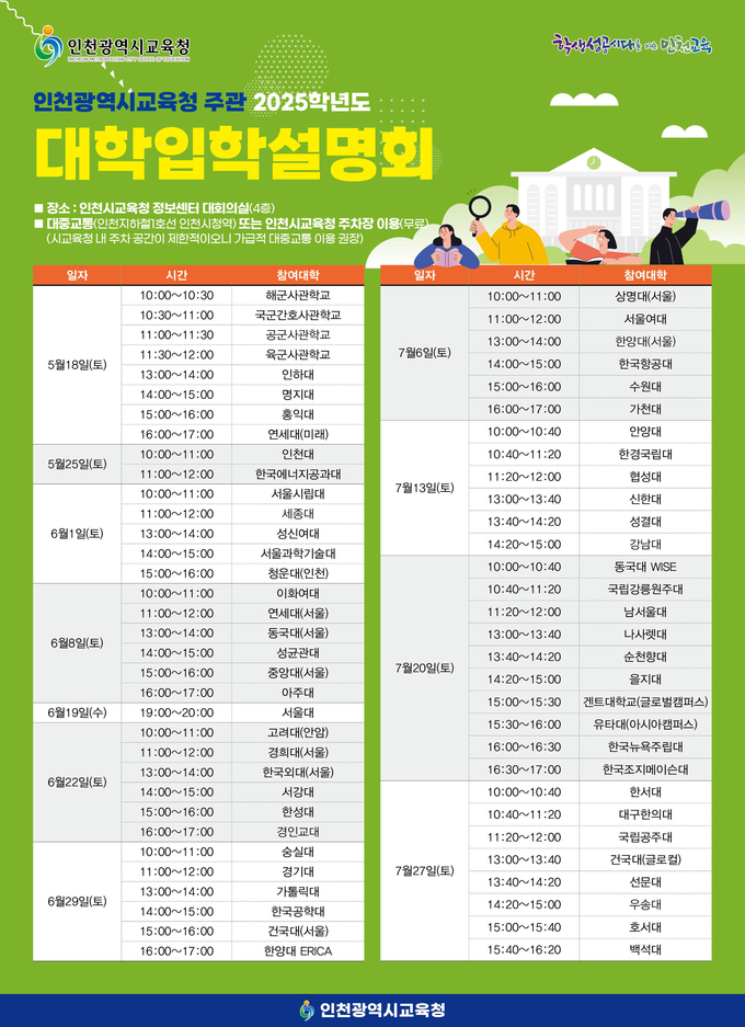 참석을 원하는 관내 대입 수험생과 학부모는 ▶인천시교육청 누리집 대회/행사 게시판 ▶인천사이버진로교육원 누리집 ▶인천시교육청 블로그 등에서 64개 대학별 세부 일정을 확인할 수 있고, 사전 예약 없이 설명회 당일 선착순으로 입장하면 된다.