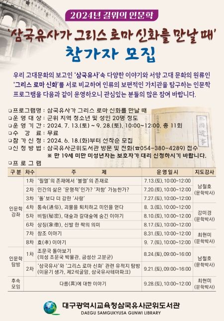 (아름다운교육신문) 삼국유사군위도서관은 2024년 길 위의 인문학 ‘삼국유사가 그리스 로마 신화를 만날 때’를 오는 7월 13일부터 9월 28일까지 11회에 걸쳐 운영한다.