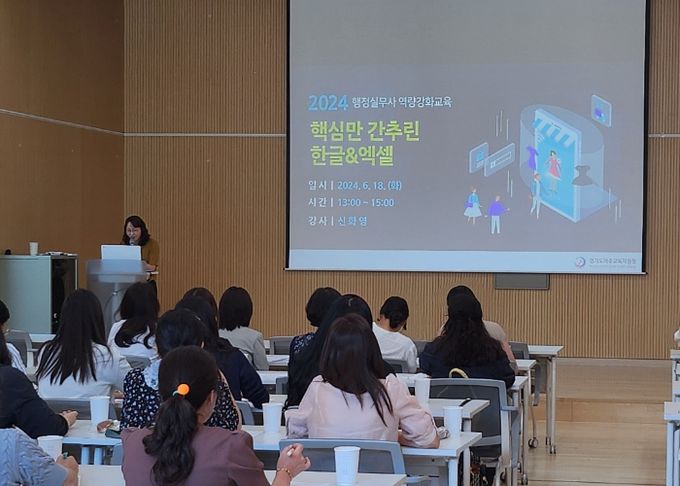 이번 연수는 행정실무사의 실무역량 강화와 체험활동을 통한 재충전을 목적으로 ▲ 공문서 작성에 도움 되는 핵심만 간추린 한글 & 엑셀(강사: 잇미디어센터 신화영), ▲ 퍼스널컬러 이미지메이킹·컬러테라피템 만들기(강사: 뷰티바이영)을 주제로 4시간 동안 진행된다.