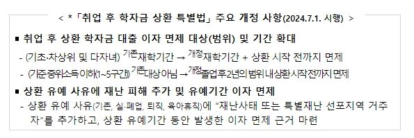 이번 시행령 개정은 청년들의 학자금 대출 이자 부담 경감을 위한 이자 면제 대상 및 기간 확대 등을 주요 내용으로 하는 '취업 후 학자금 상환 특별법(2023.12.26.개정)'이 오는 7월 1일에 시행됨에 따라 추진됐다.