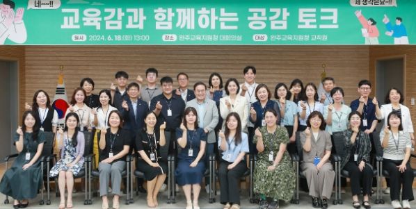 전북특별자치도교육청은 18일 서거석 교육감과 유희태 완주군수, 서남용 완주군의회 의장, 김난희 완주교육지원청 교육장이 참석한 가운데 완주문화회관에서 열린 ‘교육감과 함께하는 공감토크’를 개최했다.