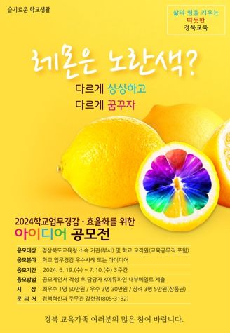 (아름다운교육신문) 경북교육청은 19일부터 다음 달 10일까지 3주간 ‘교육 가족과 함께하는 학교 업무경감 및 효율화를 위한 아이디어 공모전’을 개최한다.