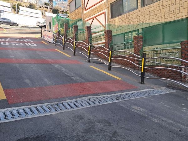그동안 위험 요인으로 지적된 정문 앞·아래쪽 급격한 경사로에 ▲바닥 면 미끄럼 방지 포장 ▲보행로 스탠실 포장 ▲차량 방호용 난간 설치 ▲아스팔트 절삭 포장 등 공사를 시행해 안전한 통학로를 구축했다.