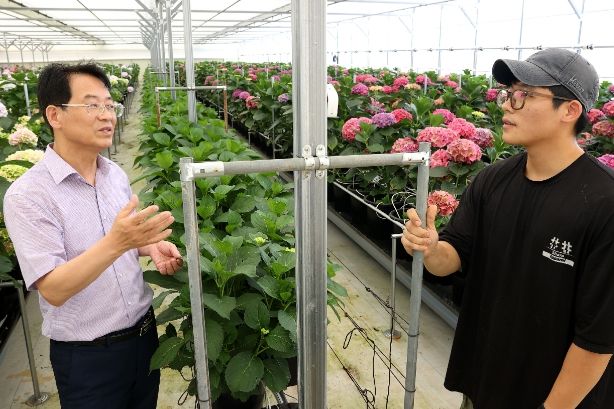이어 역시 군동면에서 절화수국 재배하우스를 운영중인 김승찬 대표의 농장을 방문해, 가업 2세의 현실에 대해 듣고 군에서 도울 것은 없는지 살폈다.