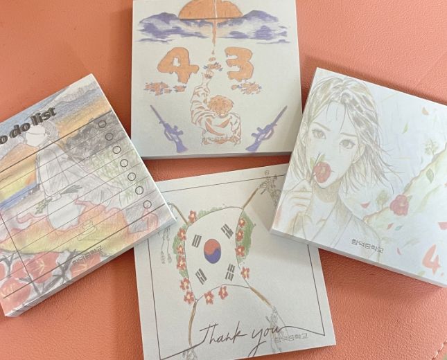 4.3 문예대회에서 전교생 대상으로 4.3을 추모하는 '일러스트 그리기' 활동을 했으며, 그중에서 우수한 작품을 선정했다. 모든 학생이 사용할 수 있는 포스트잇 제작에 이 작품들을 활용한 것이다.
