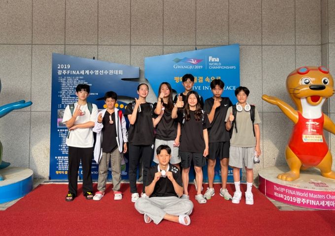 대회에는 문정민 지도자를 비롯하여 수영부 담당교사와 선수단 강승오, 고찬혁, 우주원, 임준범, 조성우, 나원영, 임준서, 조유진, 허태연 총 9명의 선수가 대회에 참가했다.