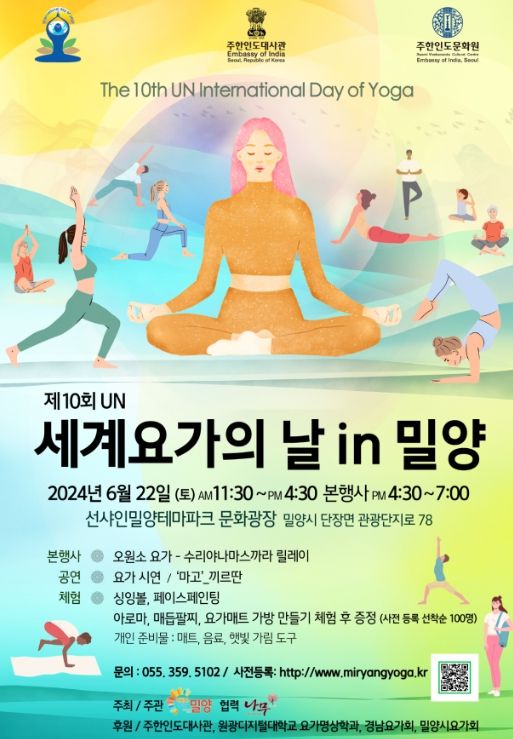(아름다운교육신문) 밀양시는 오는 22일 선샤인 밀양 테마파크 문화광장에서 ‘2024 제10회 UN 세계 요가의 날 기념행사’를 개최한다고 밝혔다.