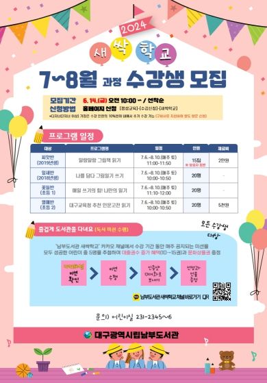 (아름다운교육신문) 대구남부도서관은 2024년 여름학기 성인 프로그램과 5세 유아와 부모 및 6 부터 8세 어린이를 대상으로 새싹학교 프로그램을 운영한다.