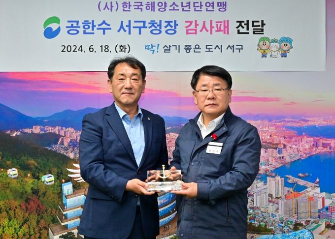 (아름다운교육신문) 부산 서구청장은 지난 18일, (사)한국해양소년단연맹으로부터 송도해양레포츠센터를 통한 청소년 건전육성과 수상레포츠 발전에 기여한 공로로 감사패를 받았다.