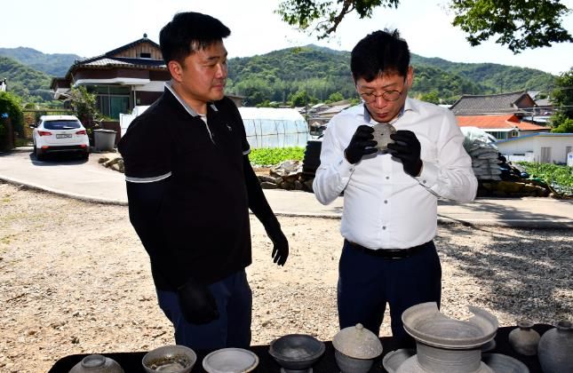 최 군수는 현장에서 ‘훈’을 직접 연주해 보며 유물의 가치를 체감하는 한편, 함께 출토된 유기물이 눌어붙은 토기에도 큰 관심을 보였다.