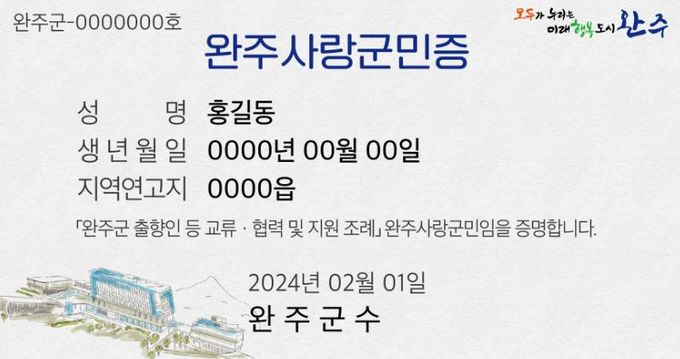 20일 완주군에 따르면 완주사랑군민제도는 주민이 아닌 출향인, 연고자, 고향사랑기부자 및 명예군민을 대상으로 군민증을 발급해주고, 시설할인 혜택을 제공하는 제도다.