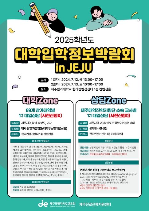 (아름다운교육신문) 제주특별자치도교육청은 도내 학생, 학부모, 교사를 대상으로 실질적인 대학 입학 정보를 제공하기 위해 7월 12일 13:00~17:00, 7월 13일 10:00~17:00 양일간 제주한라대학교 한라컨벤션센터 1층 컨벤션홀에서 『2025학년도 대학입학정보박람회』를 개최한다.