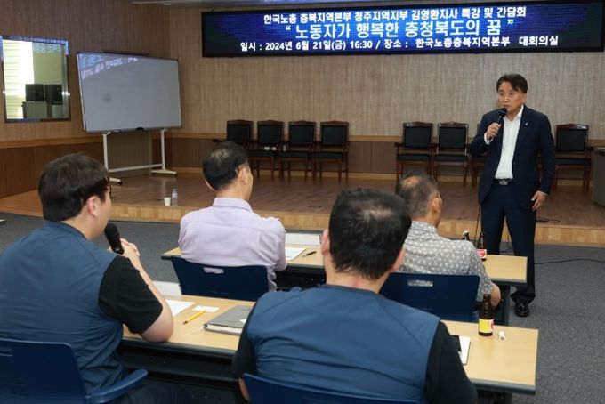 (아름다운교육신문) 김영환 충북지사는 21일 충북 노동자종합복지관(미평동)에서 한국노총 청주지부 임원 및 조합원 50여명을 대상으로'노동자가 행복한 충청북도의 꿈'이라는 주제로 특별 강연을 진행했다.