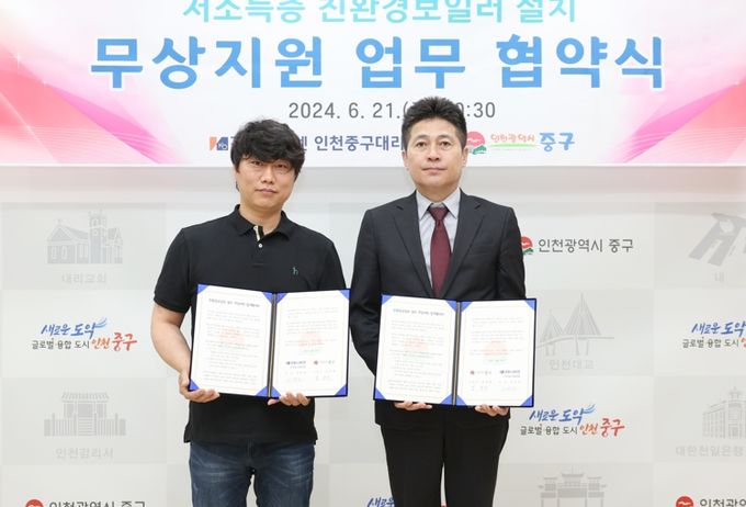 김정헌 인천 중구청장은 지난 21일 중구청 구청장실에서 ㈜경동나비엔 인천중구대리점 김영돈 대표와 이 같은 내용의 ‘저소득층 친환경 보일러 설치 무상 지원 업무협약’을 체결했다.