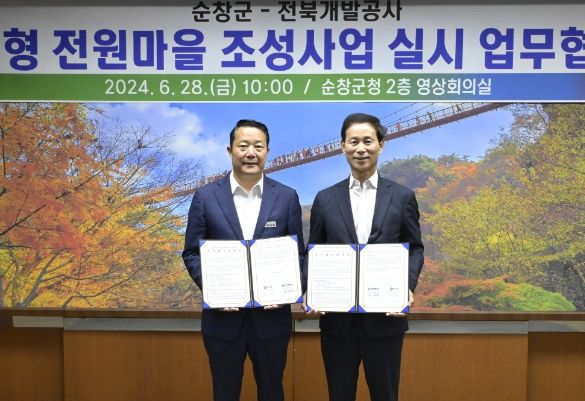 순창군이 28일 군청 2층 영상회의실에서 민선 8기 역점 사업인 순창형 전원마을 500호 조성사업의 내실 있는 추진을 위해 전북개발공사와 공동 추진을 약속하는 업무협약을 체결했다고 밝혔다.