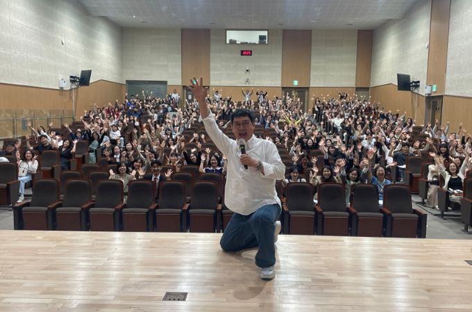첫 번째 “스위치 ON, 설렘” 강의 주제는 ‘365일 가슴 설레며 일하는 법’이며, 개그맨이자 작가인 고명환 강사가 열정적인 강연을 진행했다.