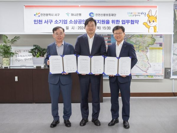 이날 협약식은 강범석 서구청장을 비롯해 전병권 하나은행 경인영업본부 지역대표, 전무수 인천신용보증재단 이사장이 참석한 가운데 진행됐다.