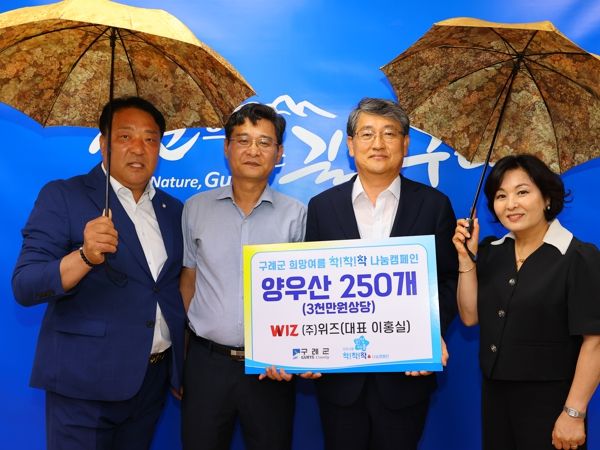 (아름다운교육신문) 전남 구례군은 지난 27일 ㈜위즈가 ‘희망여름 착!착!착! 나눔 캠페인 구례군 1호’로 어르신들의 폭염 피해 예방을 위해 양우산 250개(3천만 원 상당)를 기부했다고 밝혔다.