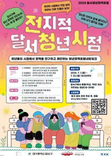 (아름다운교육신문) 대구 달서구가 7월 1일부터 지역청년들이 주도적으로 정책을 발굴·제안하는 '전지적 달서청년 시점'에 참여할 달서구 청년 30명을 모집한다.