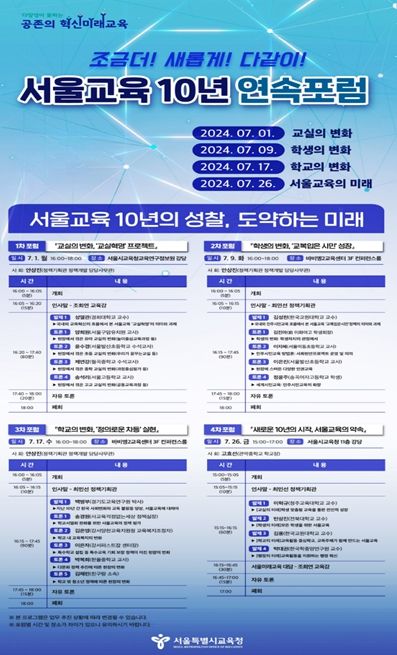 (아름다운교육신문) 서울시교육청은 ‘10년의 성찰, 도약하는 미래’를 주제로 7월 1일, 7월 9일, 7월 17일, 7월 26일 총 4회에 걸쳐'서울교육 10년 연속포럼'를 개최한다.