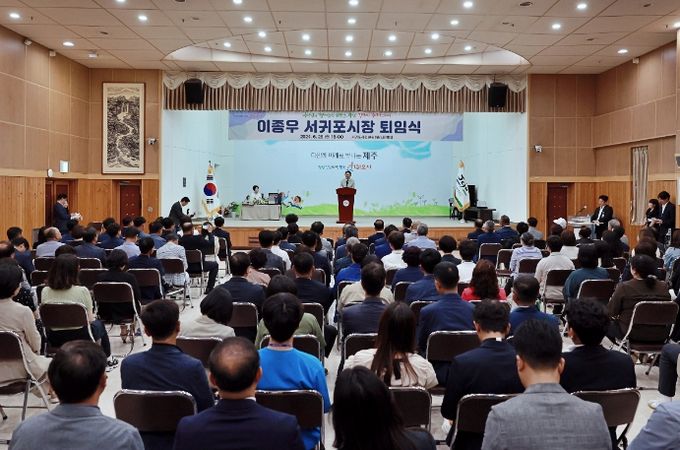 (아름다운교육신문) 이종우 서귀포시장은 2024년 6월 28일 오후 3시 서귀포시청 본관 2층 너른마당에서 퇴임식을 갖고 2년 동안 동고동락을 같이한 직원들의 환송과 기념사진을 끝으로 시장임기를 마무리했다.