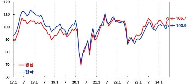 (소비자심리) 26일 한국은행 경남본부가 발표한 2024년 5월 경남지역 소비자 동향조사 결과에 따르면 5월 경남지역 소비자심리지수(CCSI)는 106.7로 전월(101.4)보다 큰 폭(5.3p)으로 상승했다.