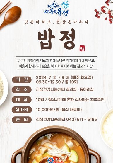 (아름다운교육신문) 대전 유성구는 9월 3일까지 총 10주간 진잠건강나눔센터에서 지역주민을 대상으로 건강음식 프로그램 ‘밥정(情)’을 운영한다.