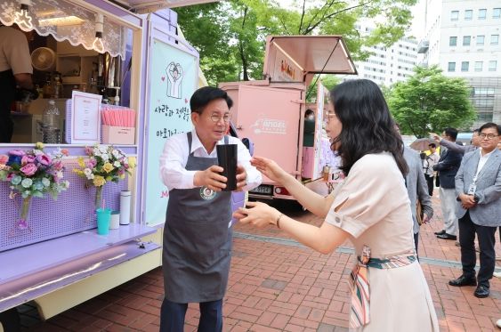 (아름다운교육신문) 박강수 마포구청장은 민선 8기 2주년 첫날인 7월 1일 오전, 구청 앞 광장에 마련된 ‘사랑의 커피차’에서 직원들에게 직접 커피를 건네며 격려의 말을 전했다.