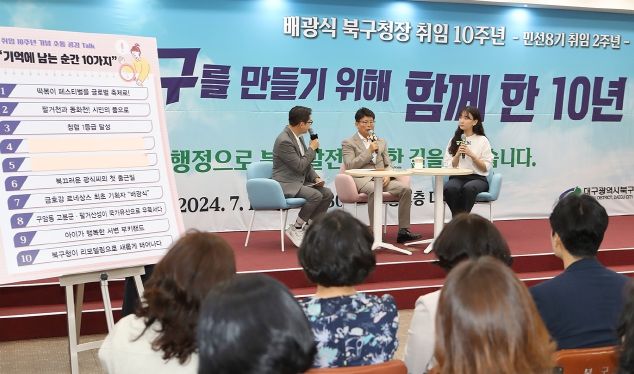 특히, 직원과 함께하는 소통공감토크는 민선6기를 시작으로 구청장 취임 10주년을 기념하여 ‘기억에 남는 순간 10가지’라는 주제로 구청장과 직원들이 소통하는 대화의 장을 마련했다. 이날 토크는 구청장의 취임 첫 출근일의 기억부터‘청렴 1등급 달성’,‘팔거천 동화천! 시민의 품으로’, ‘떡볶이 페스티벌을 글로벌 축제로!’등 다양한 주요정책들이 기억에 남는 순간으로 꼽혀 그동안의 구정을 되돌아보고 북구의 내일을 위해 각오를 다지는 자리가 됐다.
